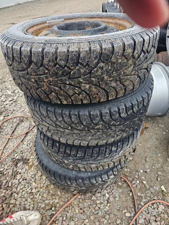 4 - 195/60R15 studded snow tires, mounted and balanced on steel wheels and they were mounted on a 1995 Saturn with 4x100mm lug pattern. they are a multifit lug wheel and will also fit some other 4 lug cars.