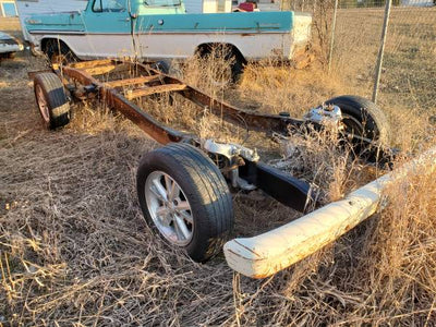 RARE 1969 F100 2wd short bed FLEET-SIDE (BUMP-SIDE) project, w/original short box chassis professionally upgraded, boxed and trued with a 2003 crown Vic p71 police interceptor front and rear axles. Has 1" rear lowering kit installed to level the truck. (ALL THE REAL HARD WORK ON THE CHASSIS IS DONE, THIS BAD-BOY WILL RIDE ALMOST LIKE CADDY) This Is a project, the chassis is rolling with the rest in pieces. 98% rust free, comes with steel wheels not the ones pictured. No motor or trans, but I do have several applications available for additional $$.